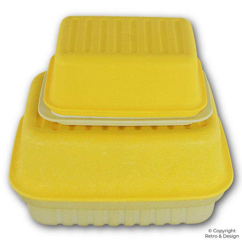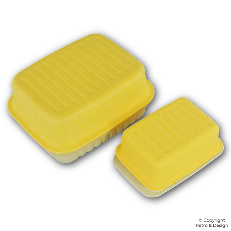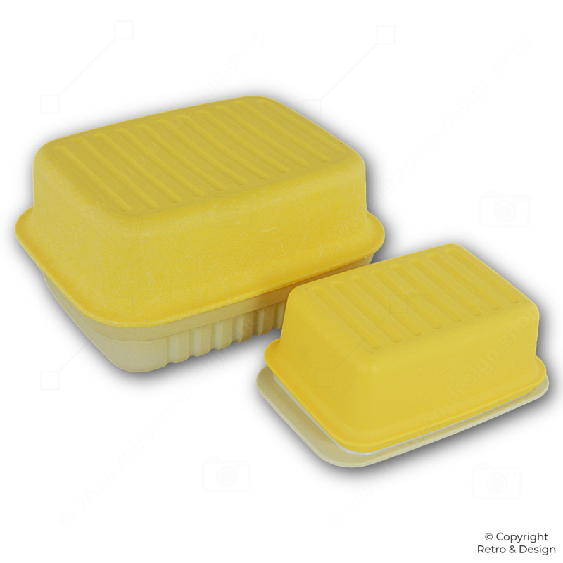 Das Set besteht aus einer Vintage Tupperware Käsebox und einer Butterdose mit cremeweißem Boden und gelbem, geripptem Deckel, die der Küche einen farbenfrohen und dekorativen Akzent verleihen.