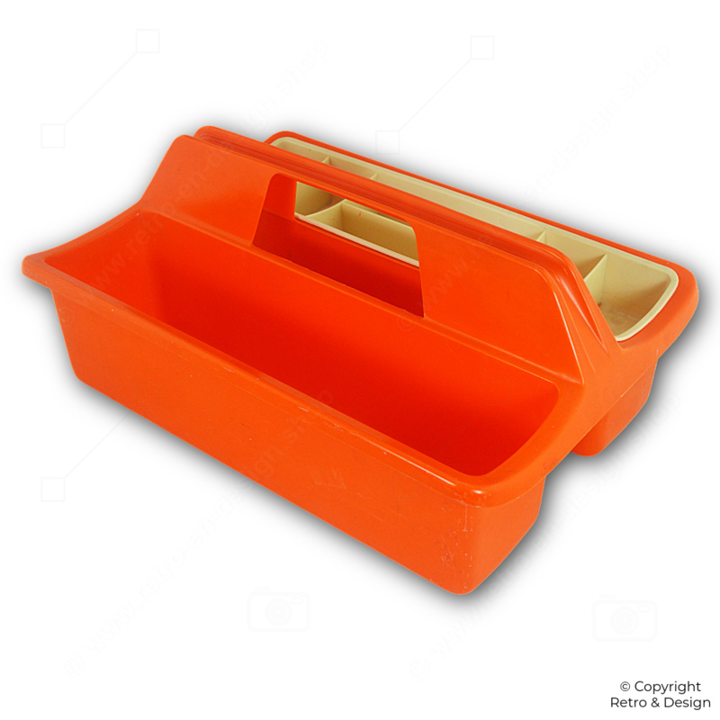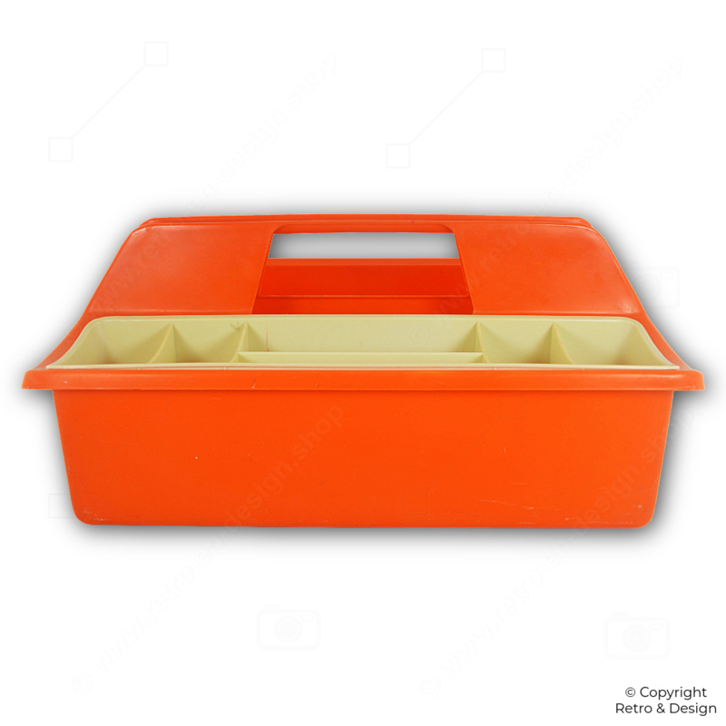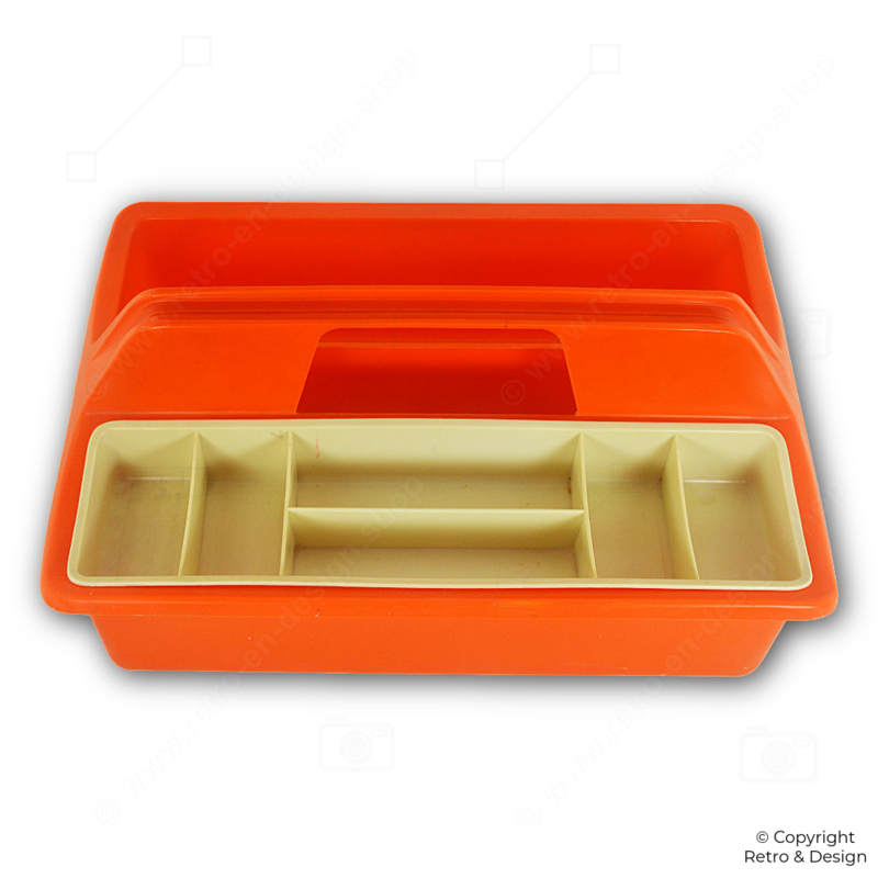 Diese originale Curver Box wurde für den praktischen Einsatz zu Hause oder in der Werkstatt entworfen. Die kompakte Größe, die praktische Einsatzschale und der 1,5 cm hohe Rand erleichtern die Organisation kleiner Gegenstände, während die fröhliche orange Farbe jedem Raum einen Retro-Touch verleiht. Die Einsatzschale steht auf vier kleinen abgerundeten Füßen, die in den Kunststoff geformt sind, und sorgt so für Stabilität und leichte Erhöhung. Vollständige Exemplare wie dieses sind selten und besonders interessant für Sammler von Vintage-Haushaltswaren.