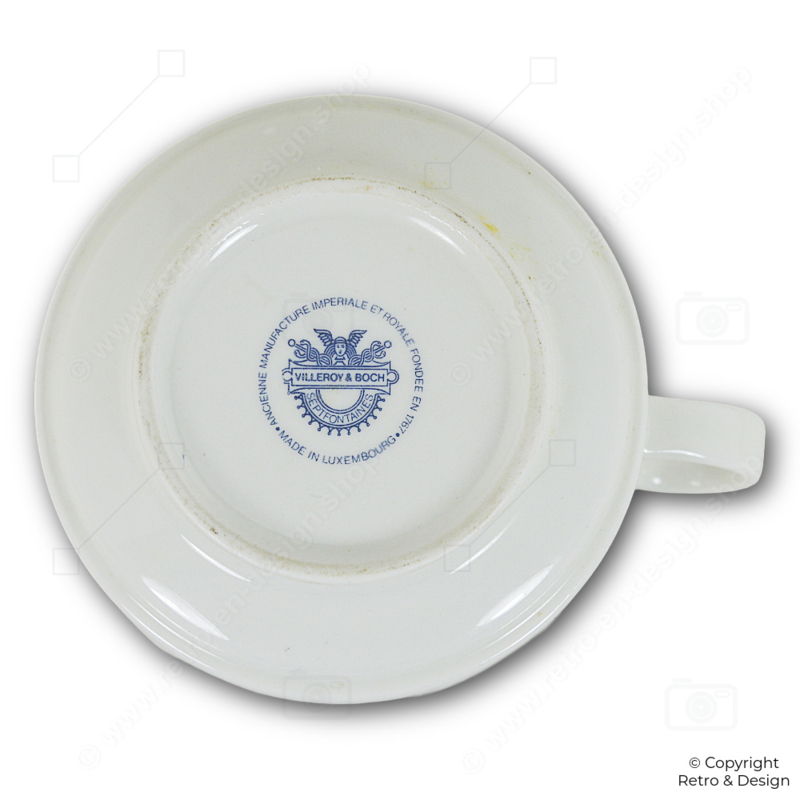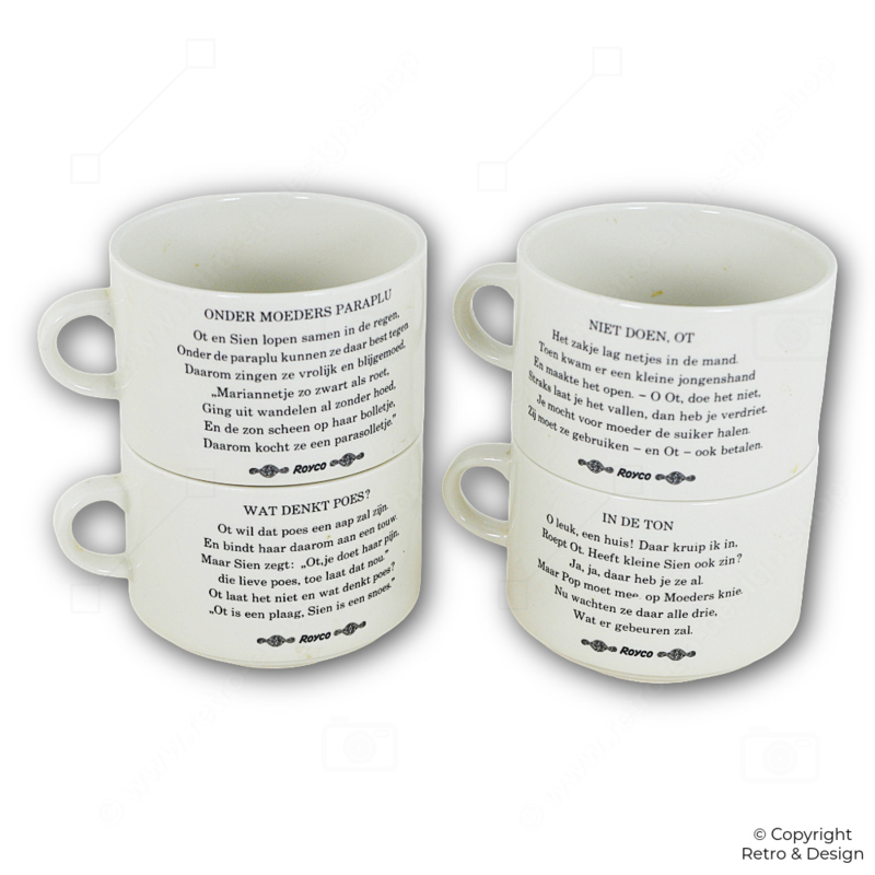 Dieses Vintage-Set aus vier Suppenschalen ist eine besondere Zusammenarbeit zwischen Villeroy & Boch Septfontaines und der niederländischen Suppenmarke Royco. Jede Schale ist mit Ot en Sien-Illustrationen verziert und enthält ein originales Kinder-Gedicht: Unter Mamas Regenschirm, Was denkt die Katze?, Mach das nicht, Ot, und Im Fass. Ein nostalgisches Sammlerstück für Liebhaber klassischer Kindergeschichten und Sammler.