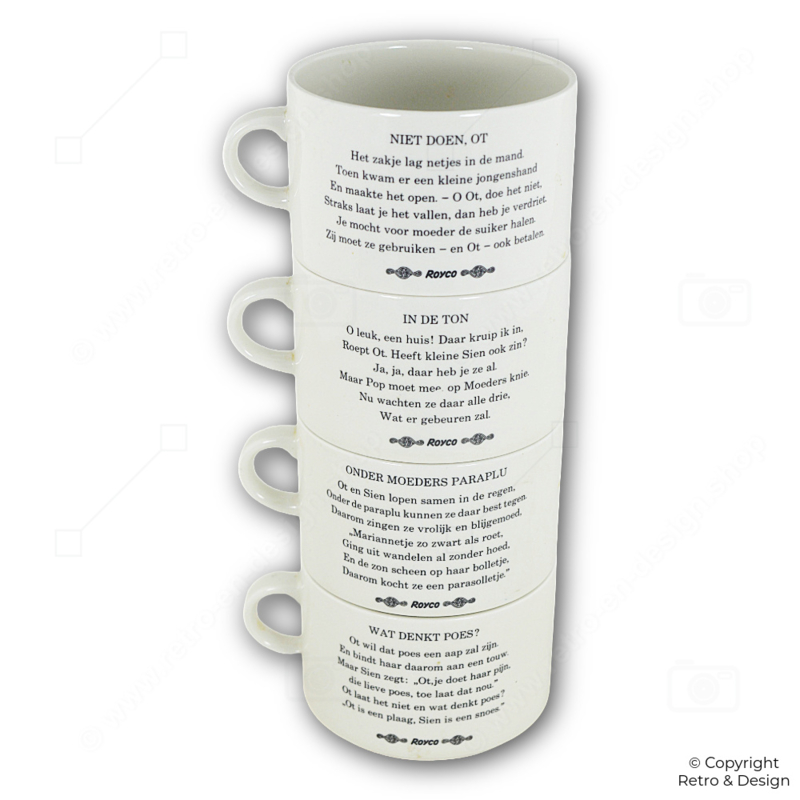 Es handelt sich um ein Set aus vier verschiedenen Ot en Sien-Suppenschalen, jede mit originalen Kinder-Gedichten, entstanden aus einer Zusammenarbeit zwischen Villeroy & Boch und Royco.