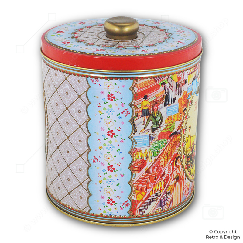 • Mit rotem Rand, Reliefverzierungen und bunten nostalgischen Illustrationen ist sie ein stilvolles und funktionales Sammlerstück, das ein Stück niederländischer Supermarktgeschichte in Ihr Zuhause bringt.